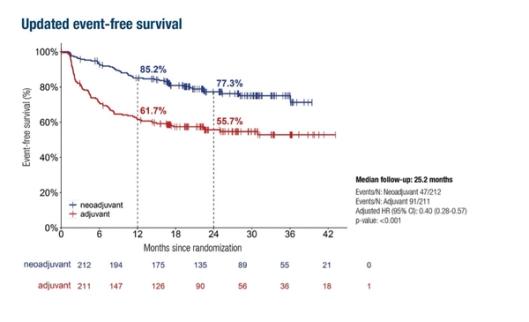 Etter tre år var 68 prosent av pasientene i den neoadjuvante gruppen uten hendelser som tilbakefall eller progresjon, mot 56 prosent i gruppen som kun fikk behandling etter operasjon. Studien viste også bedre tilbakefallsfri overlevelse i gruppen som fikk behandling før kirurgi.