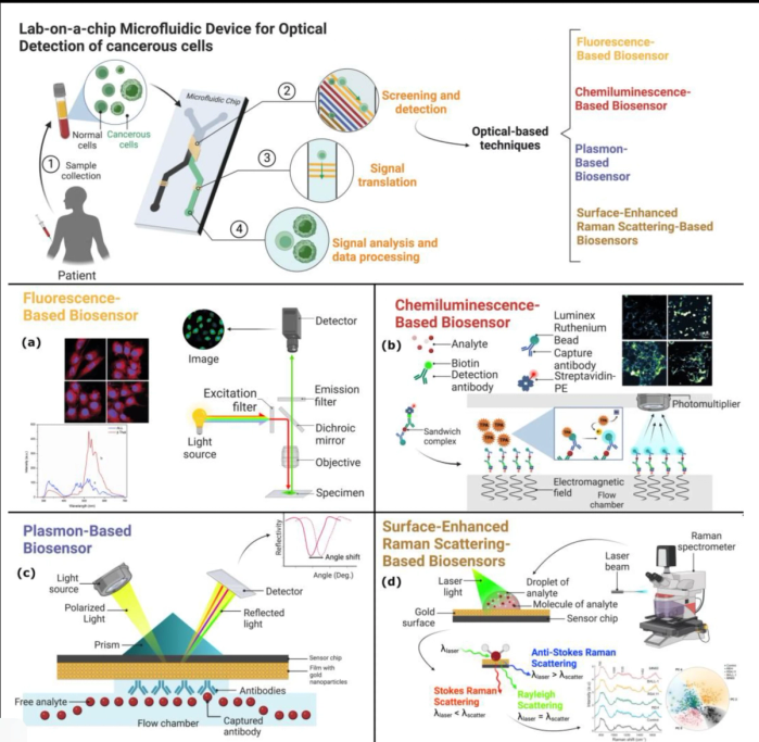 Illustrasjonen viser et “lab-on-a-chip”-system der celler føres gjennom små mikrokanaler for analyse. Optiske sensorer kan oppdage forskjeller mellom normale og kreftceller når de passerer gjennom brikken. Eksempler på slike sensorer inkluderer fluorescens- og lysbaserte biosensorer samt sensorer som måler plasmon- og Raman-signaler. Figuren gir et forenklet innblikk i hvordan Organ-on-a-Chip-teknologi kan brukes til å studere kreftceller på en presis og kontrollert måte.